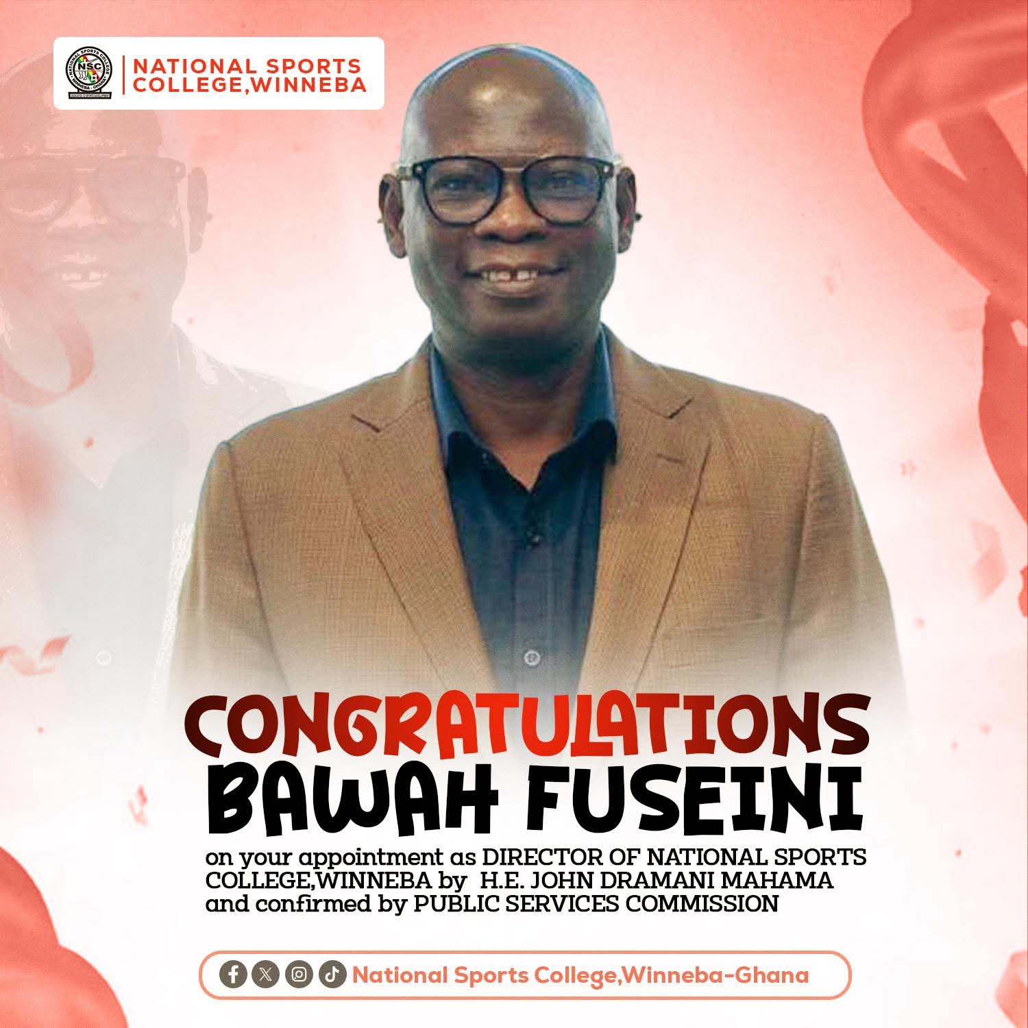 Bawah Fuseini has been appointed Director of the National Sports College, Winneba, following approval by H.E. John Dramani Mahama and confirmation by the Public Services Commission.