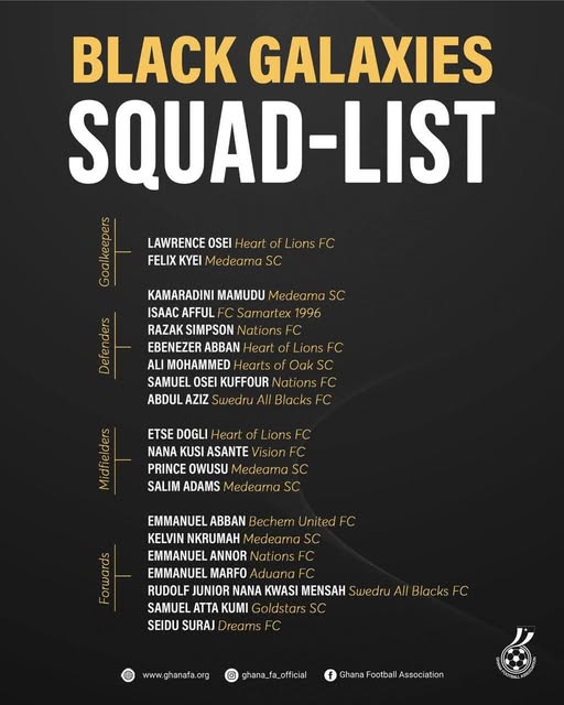 Black Galaxies head coach Kassim Osei Mingle has released a 20-man squad for the highly anticipated international friendly against Bafana Bafana of South Africa, scheduled for Tuesday, 16 December 2025, in Gauteng.