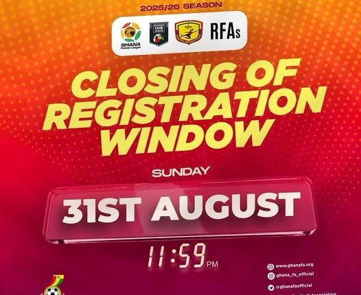 The Ghana Football Association (GFA) has officially announced that the transfer window for the 2025/26 football season will close at 11:59pm on Sunday, 31 August 2025.