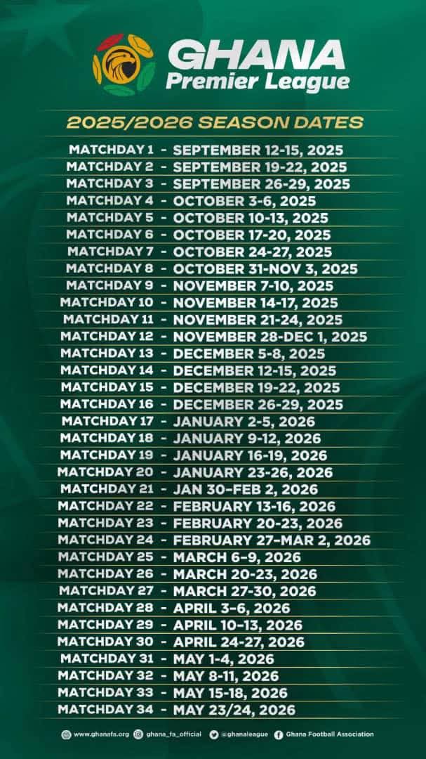 The Ghana Football Association (GFA) has officially announced the full matchday calendar for the 2025/26 Ghana Premier League season, confirming that the league will kick off on the weekend of 12th–15th September 2025 and conclude on 23rd–24th May 2026.