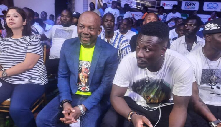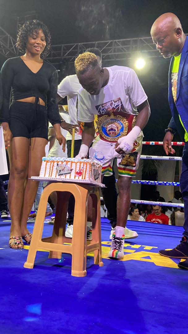 Present to support in cutting the cake were his coach Carl Lokko, Sempe Manste, Nii Adotey Obuor, son of HE John Dramani Mahama, former IBF champion Joshua Clottey and others.