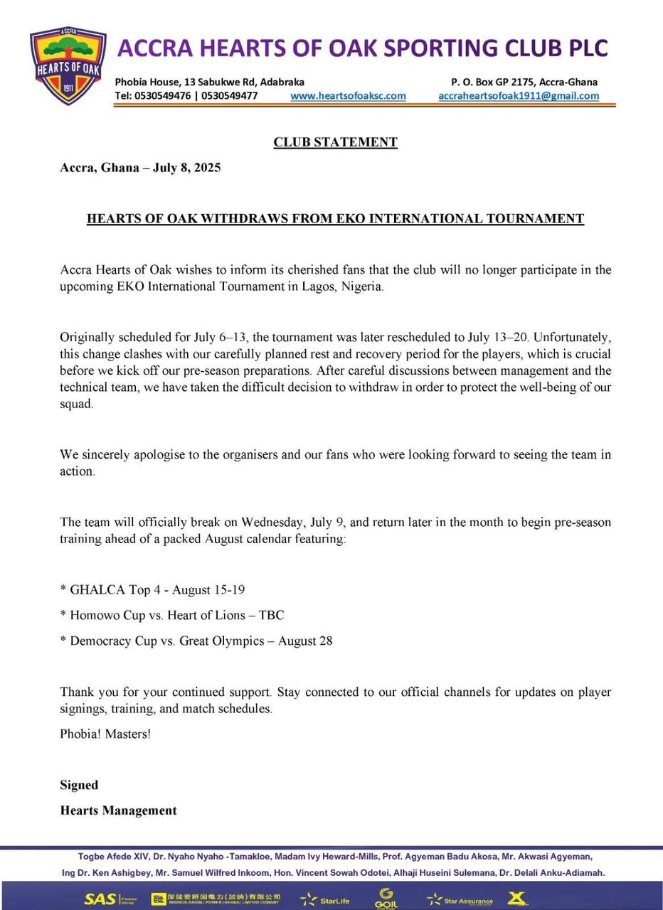 Accra Hearts of Oak have officially withdrawn from the upcoming Eko International Tournament scheduled to take place in Nigeria.