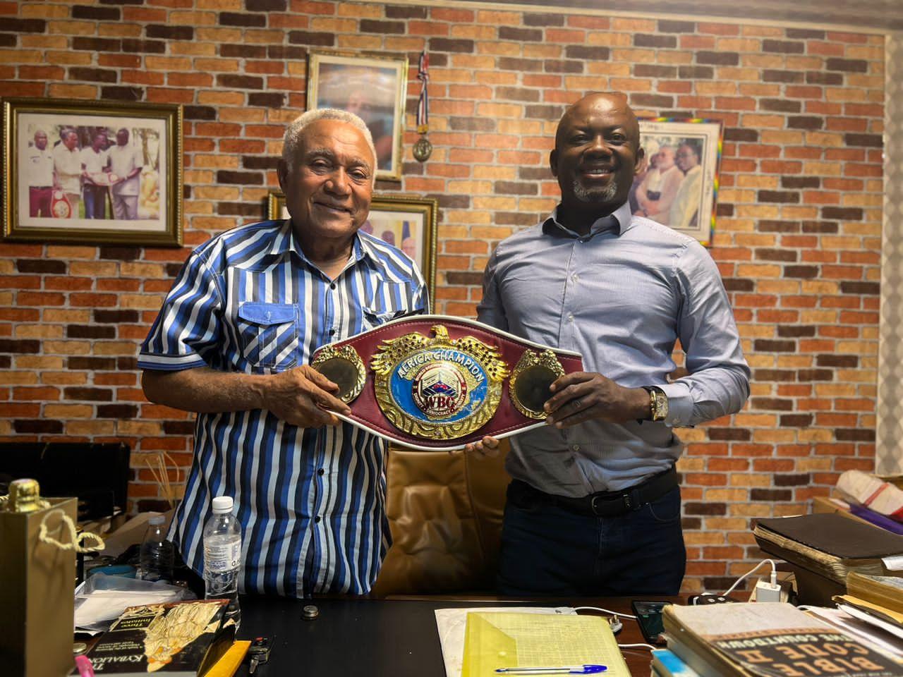 Newly crowned World Boxing Organisation WBO Africa Featherweight Champion, John Laryea aka the Expensive Boxer and his manager Mr. Sammy Anim Addo as well as coach Carl Lokko of the Bronx Gym have paid a courtesy call on the WBO Africa Representative, Mr. Samir Captan at his office.