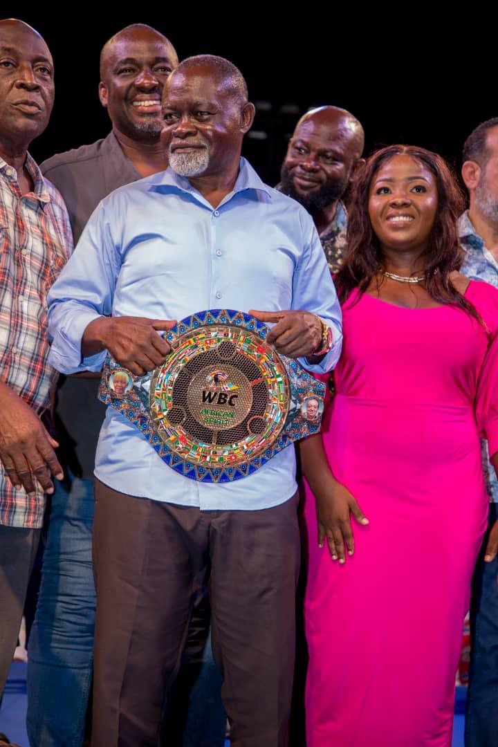 Miss Sarah Lotus Asare, Secretary of WBC Cares Africa presented a special title belt to the champion in the ring.